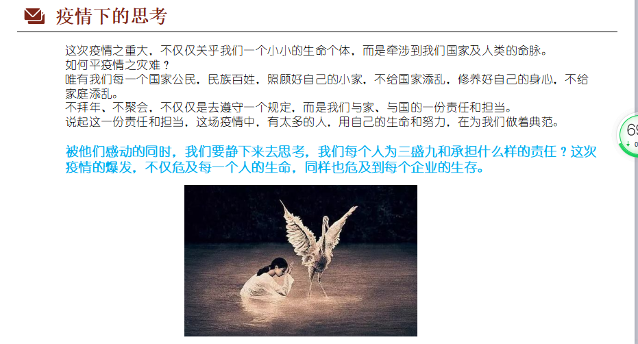 會上對員工于忠和、王強、劉紅艷三人在疫情期間為公司銷售防疫物資的出色表現(xiàn)給予了物質(zhì)及精神上的表揚。以上三人的出色表現(xiàn)充分體現(xiàn)了企業(yè)文化中想具體,做到位,勇于擔當?shù)钠髽I(yè)精神。